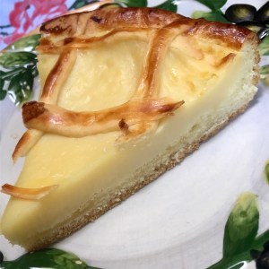 La réalisation et dégustation eût lieu hier : impossible de vous dire l’émotion de cette redécouverte, après des décennies. L’aspect déjà, ( le croisillon de pâte est facultatif) avec cette crème jaunâtre, riche, vaguement plissée sur le dessus. L’odeur : la mémoire retrouvée ! Puis enfin le goût : l’enfance, à la première bouchée ! La même pâtisserie que celle que faisaient avec soin jadis ma mère et mes tantes !