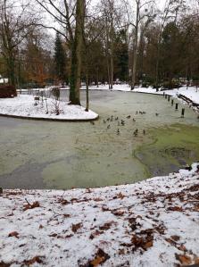 Les canards ébahis marchent sur la glace
